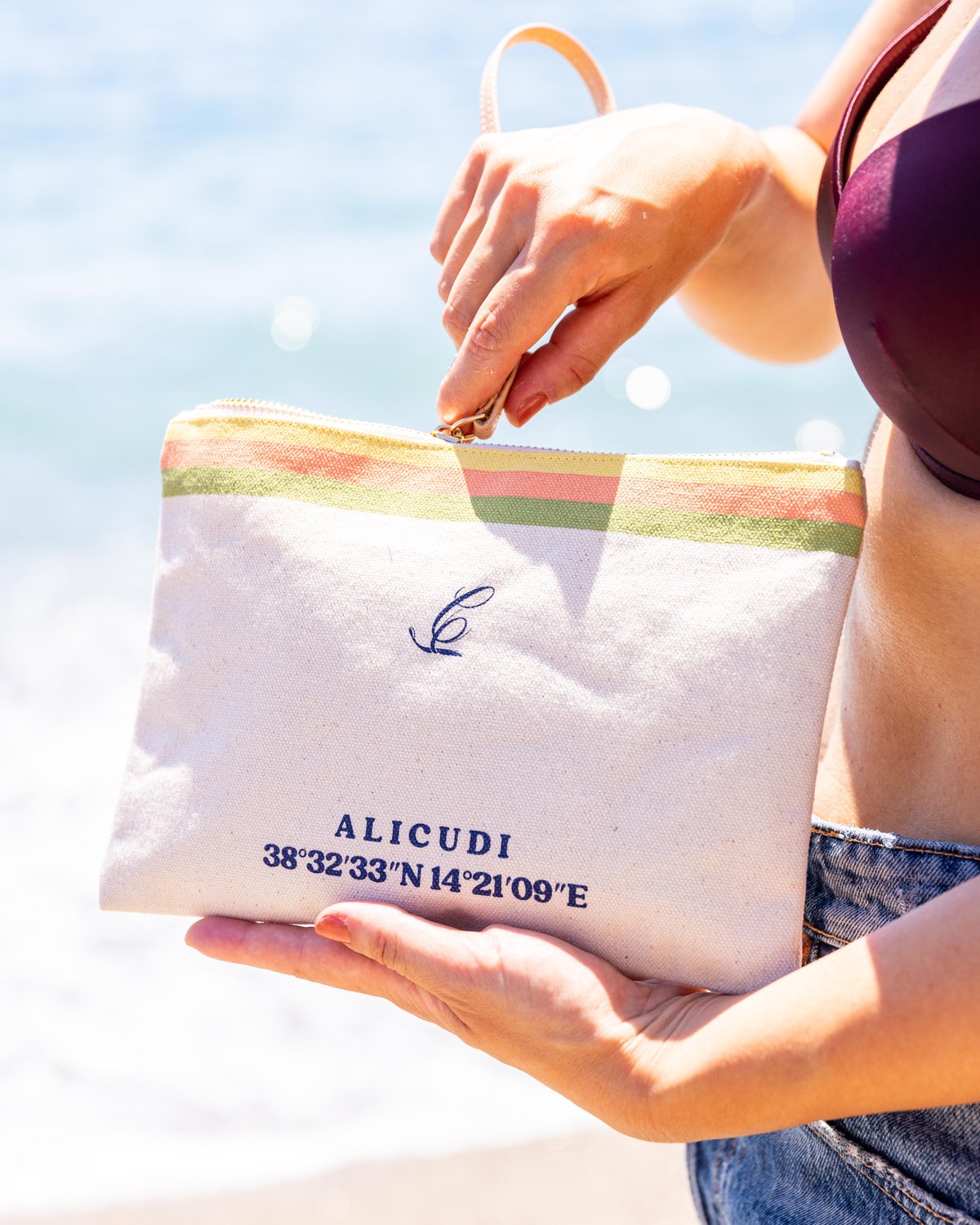 La nostra pouch da mare, della Collezione "Aeolian Essentials", ispirata ai colori dell'isola di Alicudi.
