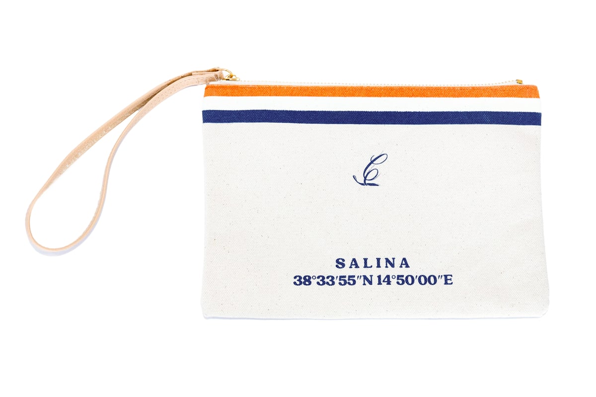 La nostra pouch da mare, della Collezione "Aeolian Essentials", ispirata ai colori dell'isola di Salina.