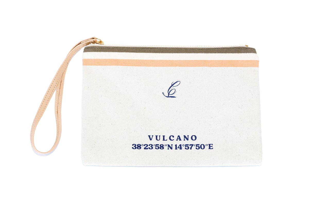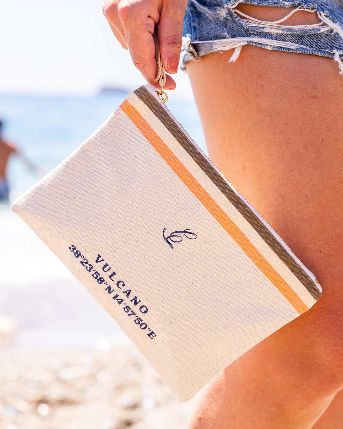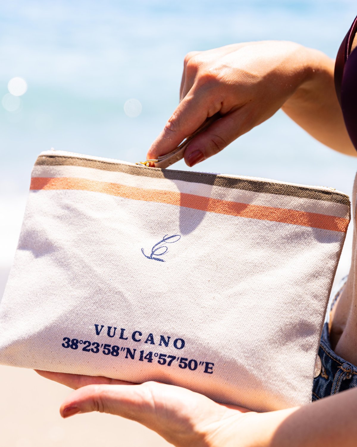 La nostra pouch da mare, della Collezione "Aeolian Essentials", ispirata ai colori dell'isola di Vulcano.